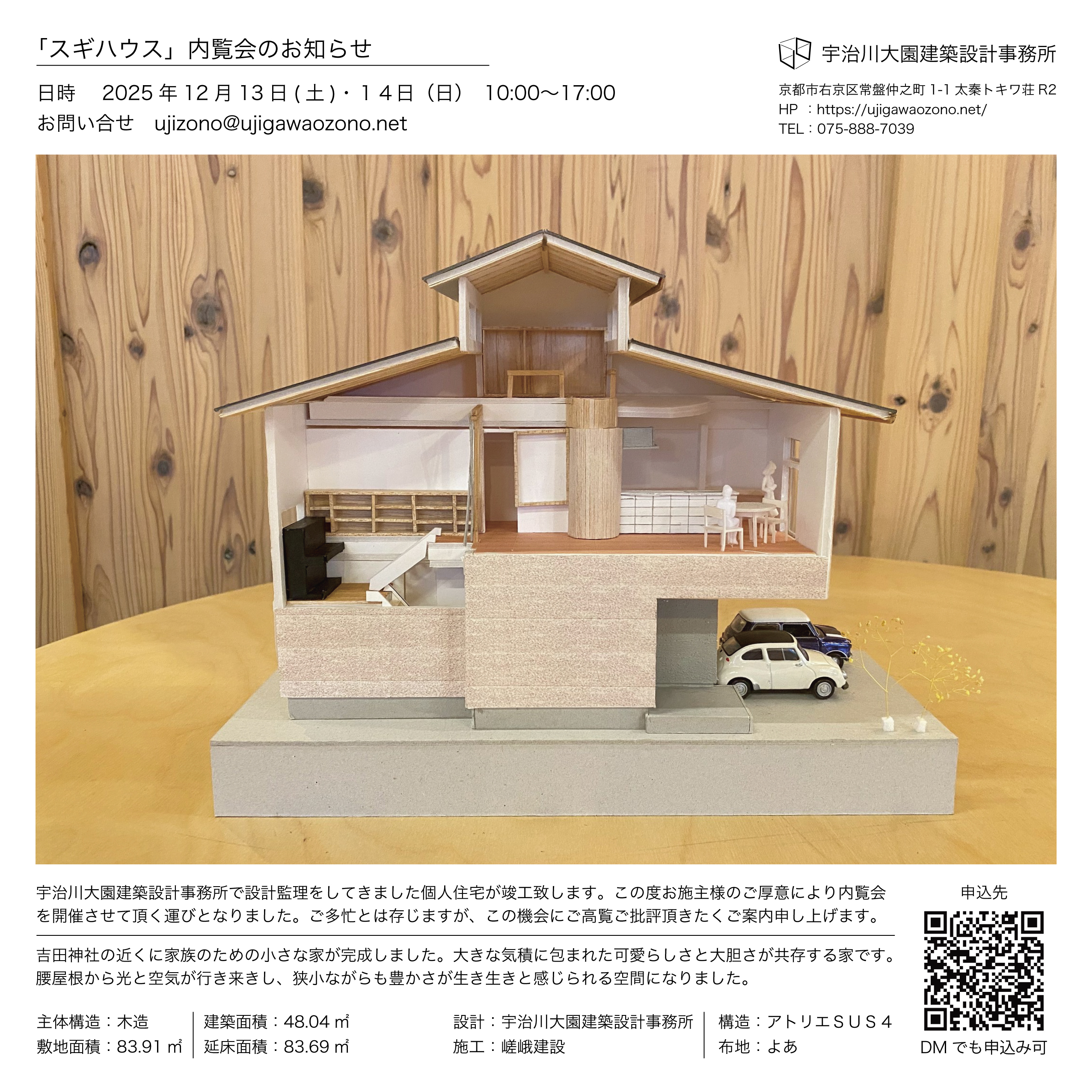 宇治川大園建築設計事務所で設計監理をしてきました個人住宅が竣工致します。 この度お施主様のご厚意により内覧会を開催させて頂く運びとなりました。 日時:2025年12月13日(土)・14日(日)10:00〜17:00 場所:京都市左京区吉田神社近く(申し込みいただけましたらメールにて詳細な位置をご案内いたします) 市バス「京大正門前」から徒歩7分 京阪電車「出町柳駅」から徒歩20分 応募フォームよりご予約ください。
